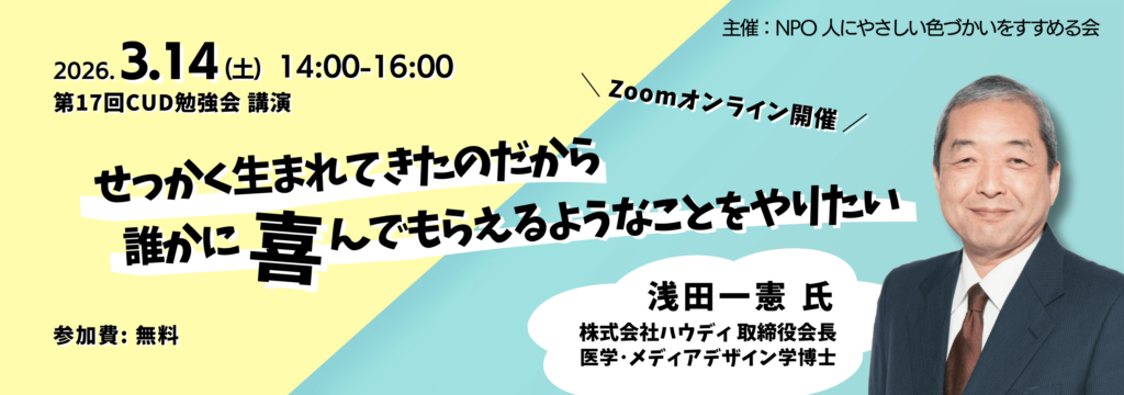 愛知県でカラーユニバーサルデザイン(CUD)をひろめる活動をしている私たちNPO人にやさしい色づかいをすすめる会は、CUDについて、関係する各界の専門家にわかりやすく語っていただく講演会を企画してきました。今回は、団体設立10周年記念企画として、株式会社ハウディ 取締役会長であり医学・メディアデザイン学博士浅田一憲氏をお招きします。浅田氏はCUDの普及に大きく貢献する無償アプリ「色のシミュレータ」や「色のめがね」など世界中で利用されるツールの開発者です。ご自身の経験談や現在の取り組み、未来への挑戦について、視覚や色覚の話題を中心に分かりやすく語っていただきます。多彩な専門分野を横断して社会の課題と結びつけ、視覚、色覚の多様性をはじめ、人の未来を明るくする浅田氏の姿勢と活動から多くを学びます。講演後半は質疑応答時間を多く取ります。貴重なこの機会に、ぜひ多くの方にご参加いただきますよう、ご案内申し上げます。