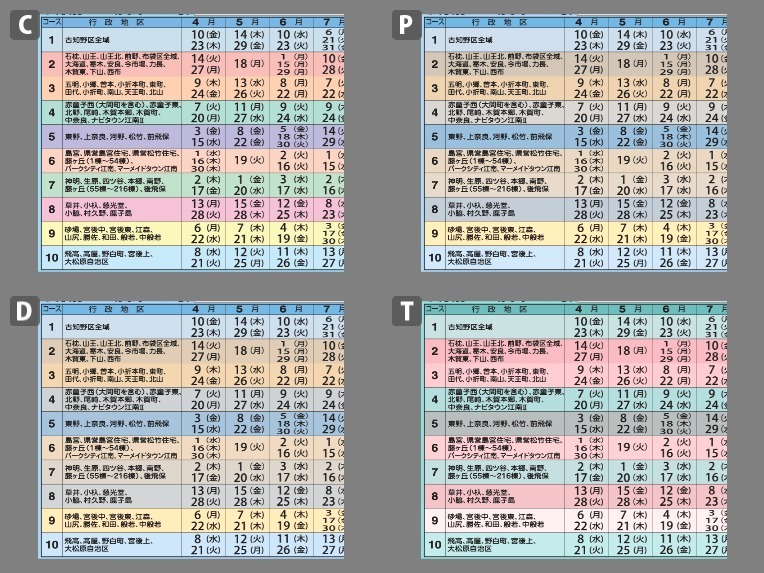 → 分別ごみ(資源ごみ等)の各コースの背景は色分けされているが、特に意味はないとのこと。色分けされていると、そこに何か意味があると思い、つい同じ色がないかを探してしまう。しかし実際には同じ色はひとつもなく、微妙な色の違いで10地区が色分けされている。それによってどの色覚タイプのひとにも、ちょっとした戸惑いが生じることになる。一般色覚者は、一見同じように見える色(たとえば1と10,3と6等)を見てその意味を探ろうとするが、直ぐにそれぞれ色が微妙に異なることに気づいて、色分けに意味がないことを知る。一方色弱者にとっては、戸惑いが深まるかもしれない。なぜならシミュレーションが示すように、まず似た色を見極めること自体が難しいからだ。[画像添付] そして色分けの意味を知ろうと、さらに目を凝らして文字情報を探すことになるかもしれない。このように意味のない色分けは避けた方がよい。ではどうすればよいか。たとえば1段おきに無色、淡いグレーの背景色を繰り返すなど、規則性を持たせ、色数を減らすと良い。